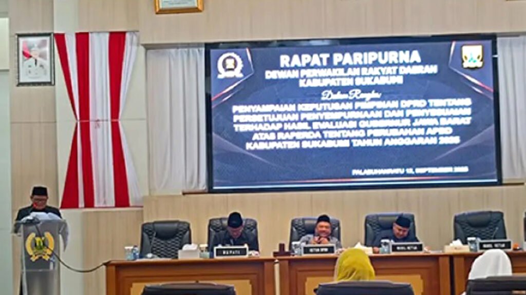 DPRD Kabupaten Sukabumi bersama Pemerintah Kabupaten (Pemkab) Sukabumi menggelar rapat paripurna lanjutan untuk menyesuaikan hasil evaluasi Gubernur Jawa Barat terhadap Rancangan Peraturan Daerah (Raperda) tentang Perubahan APBD 2025, Jum’at (12/09/2025).
