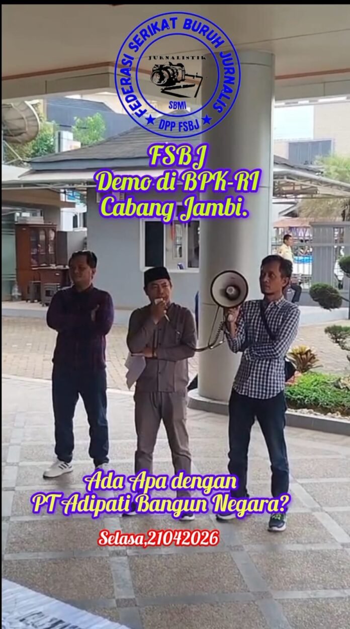Ketua Federasi Serikat Buruh Jurnalis (FSBJ), Doner Gultom, memimpin langsung aksi damai di kantor Badan Pemeriksa Keuangan (BPK) RI Perwakilan Jambi, Selasa (21/4/2026).
