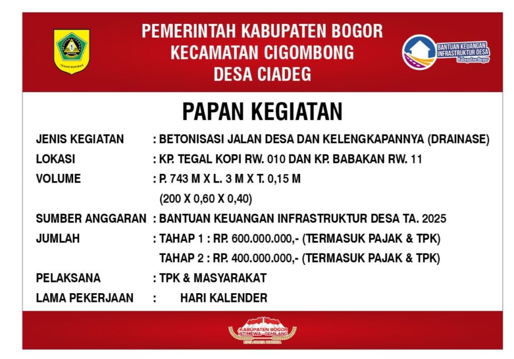 Kepala Desa Ciadeg Wahyu Rahayu menjelaskan Bantuan keuangan infrastruktur desa tahun ini di fokuskan ke kampung Tegal Kopi RW 10 dan Kampung Babakan RW 11, karena jalan ini merupakan akses masyarakat untuk Pendidikan, Kesehatan dan Pertanian.
